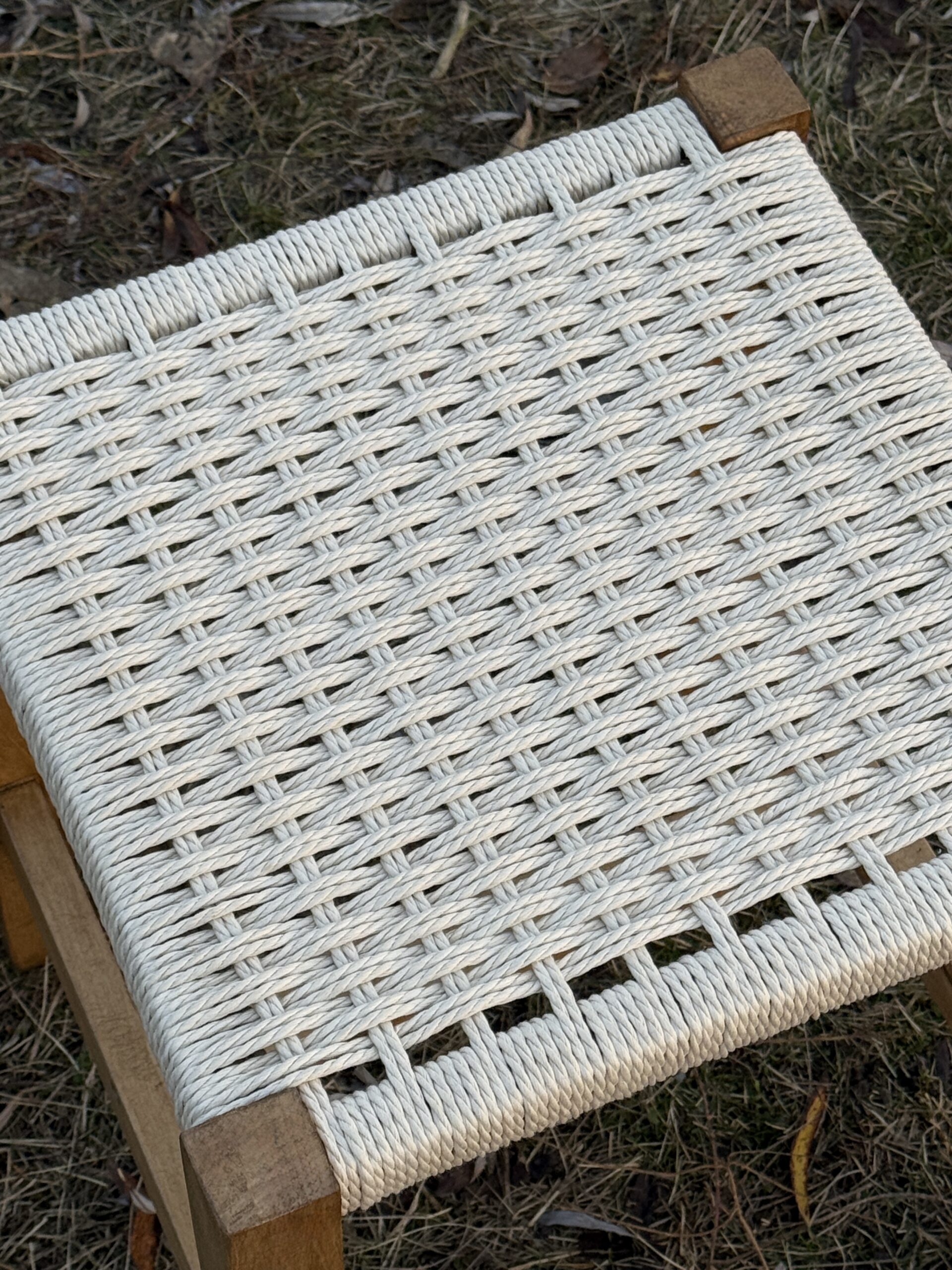 Taburet împletit manual din coardă fină daneză, cu structură solidă din lemn. Design nordic, confortabil și rezistent, potrivit pentru orice interior. Dimensiuni: 37 × 37 cm, înălțime 42 cm.